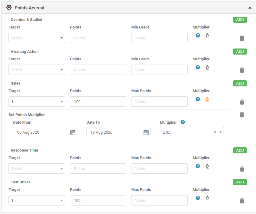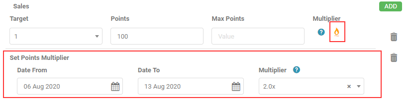 MULTIPLIERS to earn points at a higher rate. To set up a multiplier just click on the flame icon and set a Date From and a Date To to determine the period the multiplier will apply. You can then set the rate at which they will earn points from several pre-determined options. For the duration of the period if they achieve the KPI they will earn double/triple etc points. This feature can be used to further incentivise activity when required.