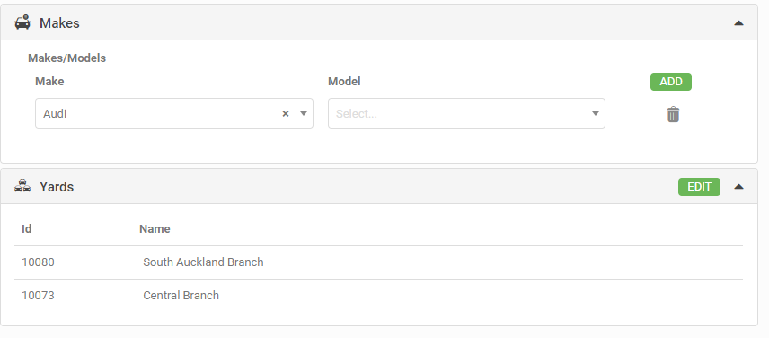 YARDS. When set up only the leads where the primary listing matches the specified Make, Model or Yard will qualify to earn rewards points. You can add as many combinations as you like via the green 'ADD' button.