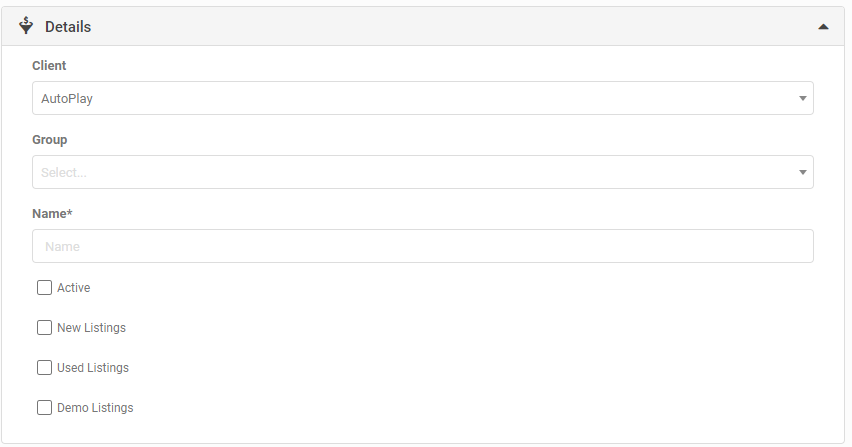 - Select the Client if you are setting this up for a single dealership. If the Client you are in is the parent in a AutoPlay Rewards group you will see the 'Group' option here