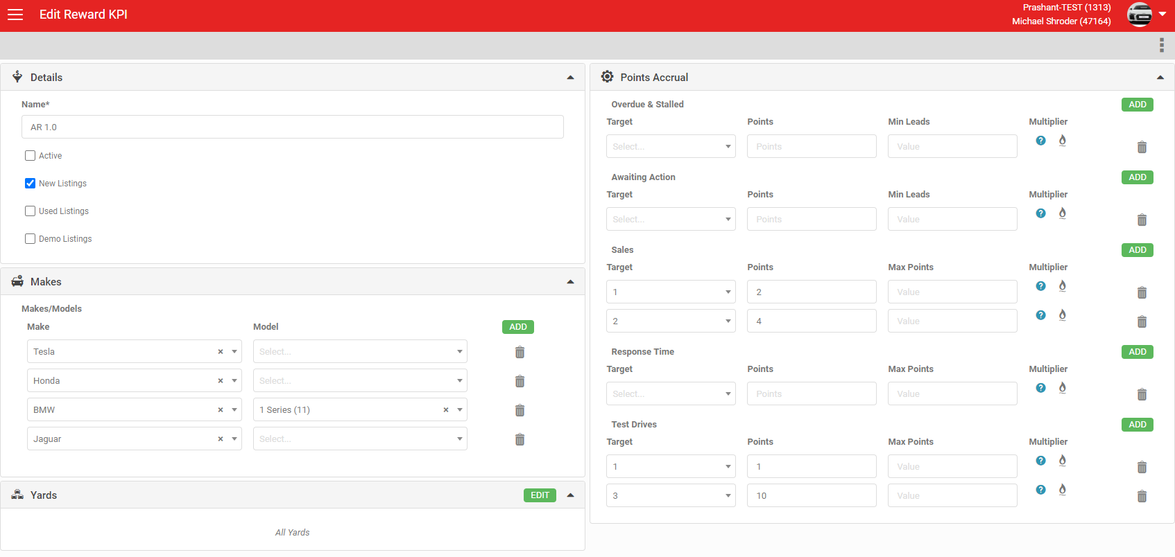 - Test Drives - e.g A sales person could earn x points per test-drive [points accumulate as vehicles are marked against this kpi as the month progresses]