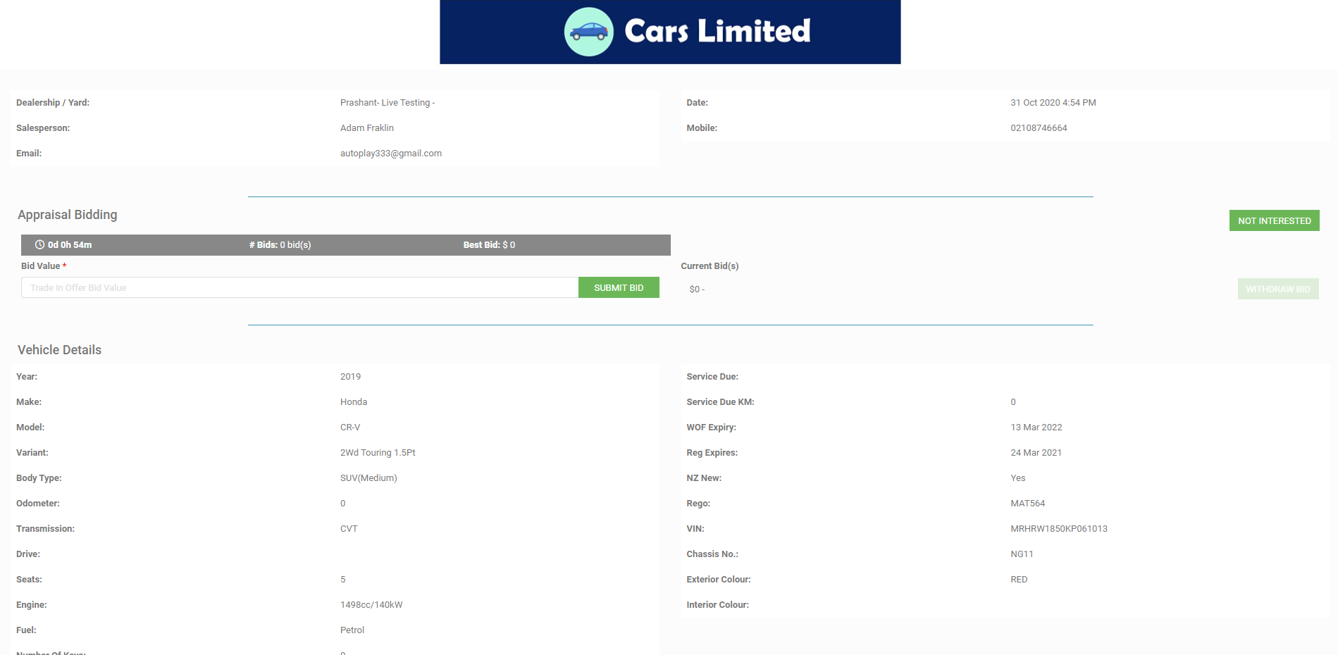 Any recipient of this link whether they are a Dealer in the Dealer Group or a Wholesalers can submit a offer on this vehicle. They can also indicate they are not interested by clicking the 'NOT INTERESTED button. If they click this button they will not receive any more comms about this particular Appraisal.