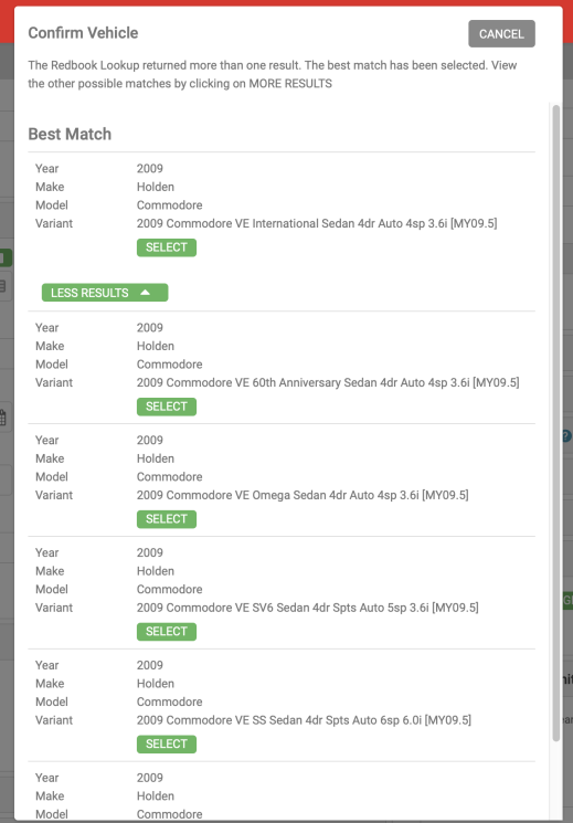 In 20.10.2 we've refined how we display the 'Best Match' that is returned from Redbook. Instead of seeing all results with the Best Match at the top, AutoPlayAuto.com now presents the best match only on the initial results screen. You can click on the 'MORE RESULTS' button to view the other records returned in the Redbook query. As with existing functionality, click on the SELECT button to apply that Redbook data to your Appraisal Form.