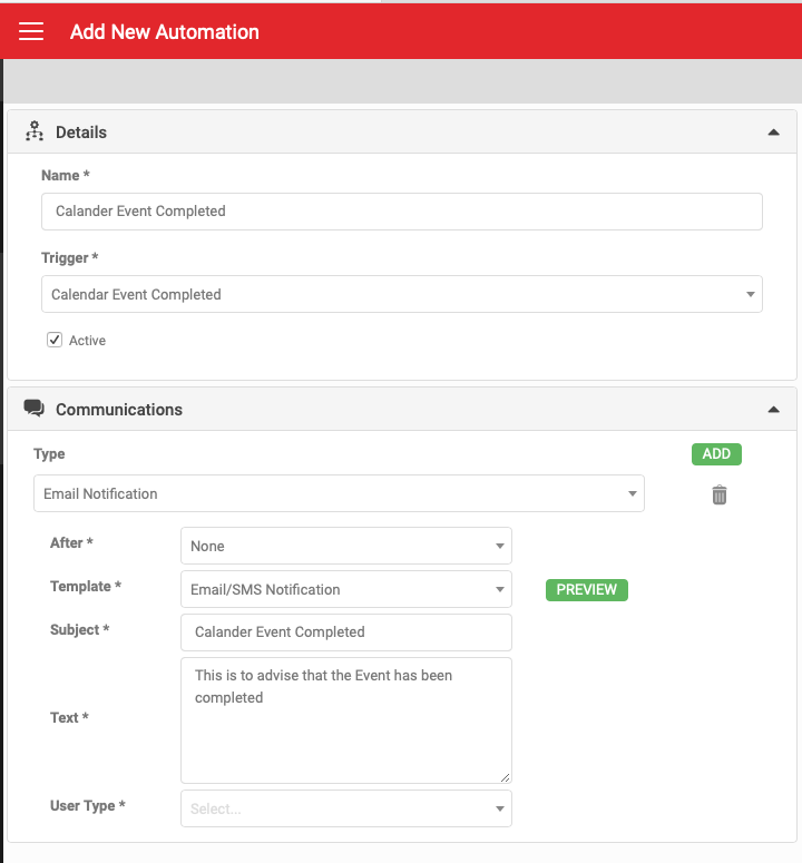 In addition the ability to se up Default text for each of the Trigger and Communication Types is also available. These can be configured by accessing the 'Automation Defaults' screen on the LHS Menu.