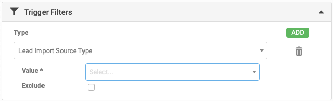When Selecting Lead Created as a Trigger Setting, there is a new Type of Trigger Filter - 'Lead Import Source Type'. When this is selected the following values can be included or excluded as required.