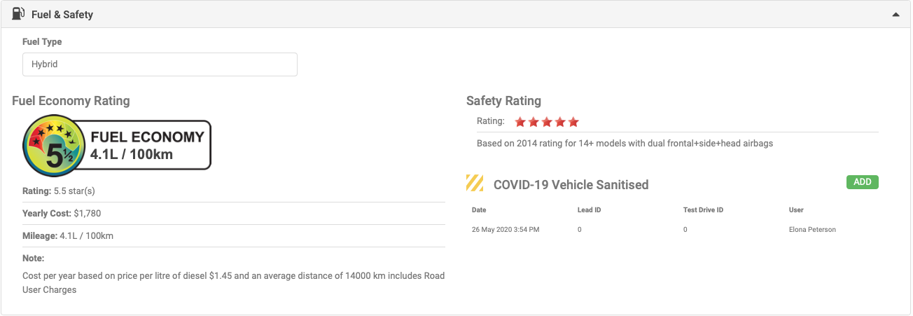 The 'Covid-19 Vehicle Sanitised' feature is in the 'Fuel and Safety' section of the LIsting. On click of 'Add' the 'Vehicle Sanitisation' pop up displays for the User to sign.