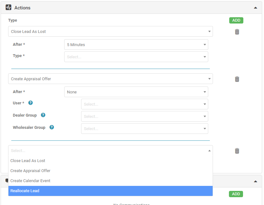 This setting enables automation settings to be set for specific Event Types - for example setting up a thankyou message when a 'Booked Test Drive' is completed.