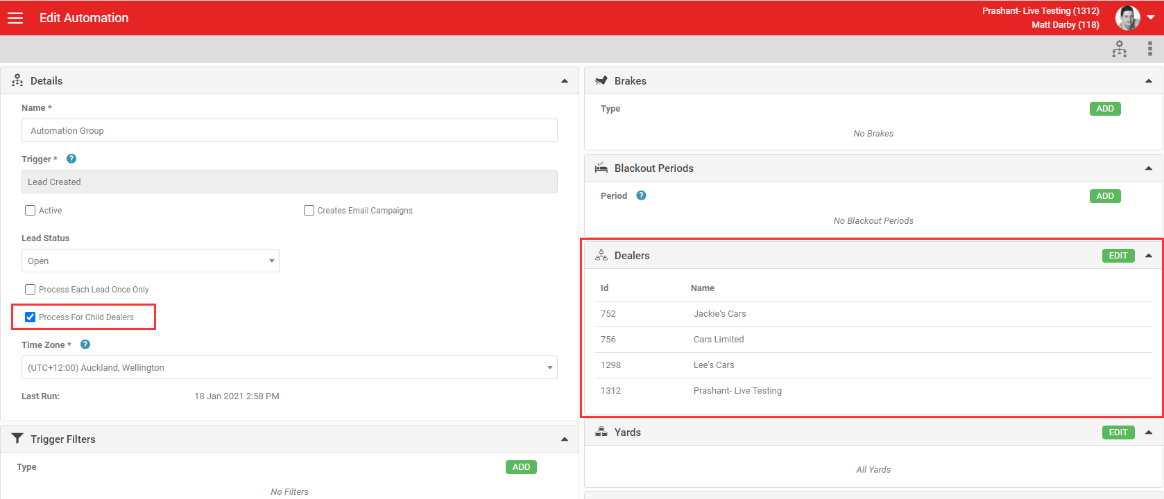 When setting up Automation for Groups you are restricted to selecting Yards that are enabled as 'brochureware' only. If you need to specify other yards within the dealership you will need to set up either individual automation settings in the dealers account, or utilising the 'Make' filter options to control which leads trigger the automation without needing to specify individual Yards.