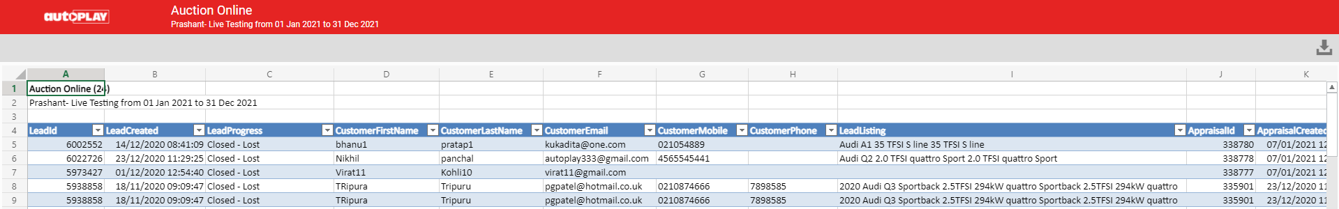 This will return a CSV containing all of the Appraisals that have been exported to Auction Online during the selected date range for the account.