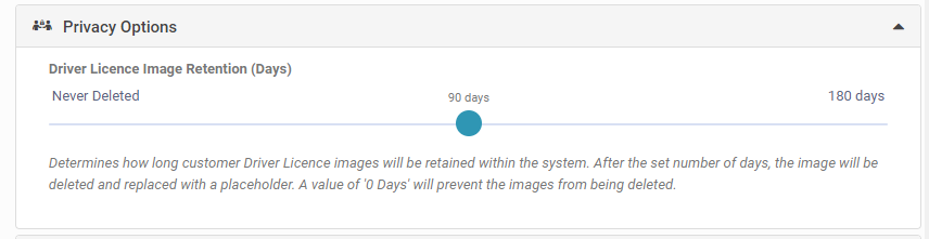 For NZ dealers in particular the Privacy Act stipulates that businesses should not hold on to customer data for longer than they need to. We have set the default to 90 days and we strongly recommend staying at this default setting, however the number of days the D/L image is held is customisable by account. Under Settings>My Company>Privacy Options there is a slider which can be used to set the number of days your account will store Licence image before replacing them with a thumbnail.