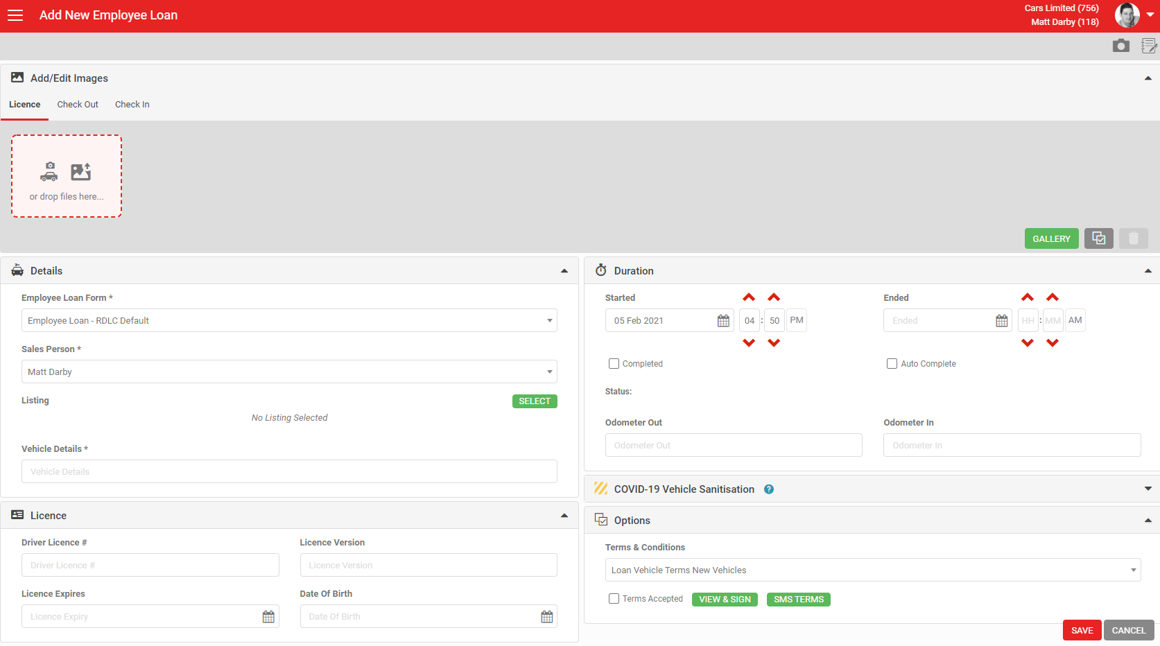 Selecting an Employee bypasses all the mandatory field requirements for customers and saves a lot of time when creating Loan Car Forms for staff. It is still possible to take photos of the employees drivers licence, get T&C's signed and check the vehicle in and out, but the rest of the process is more streamlined to reflect the fact you already know who your staff are. When viewing one of these records in the Vehicle Registry it will be flagged as Type=Employee, the Contact Name will be blank and the Salesperson name will be visible instead.