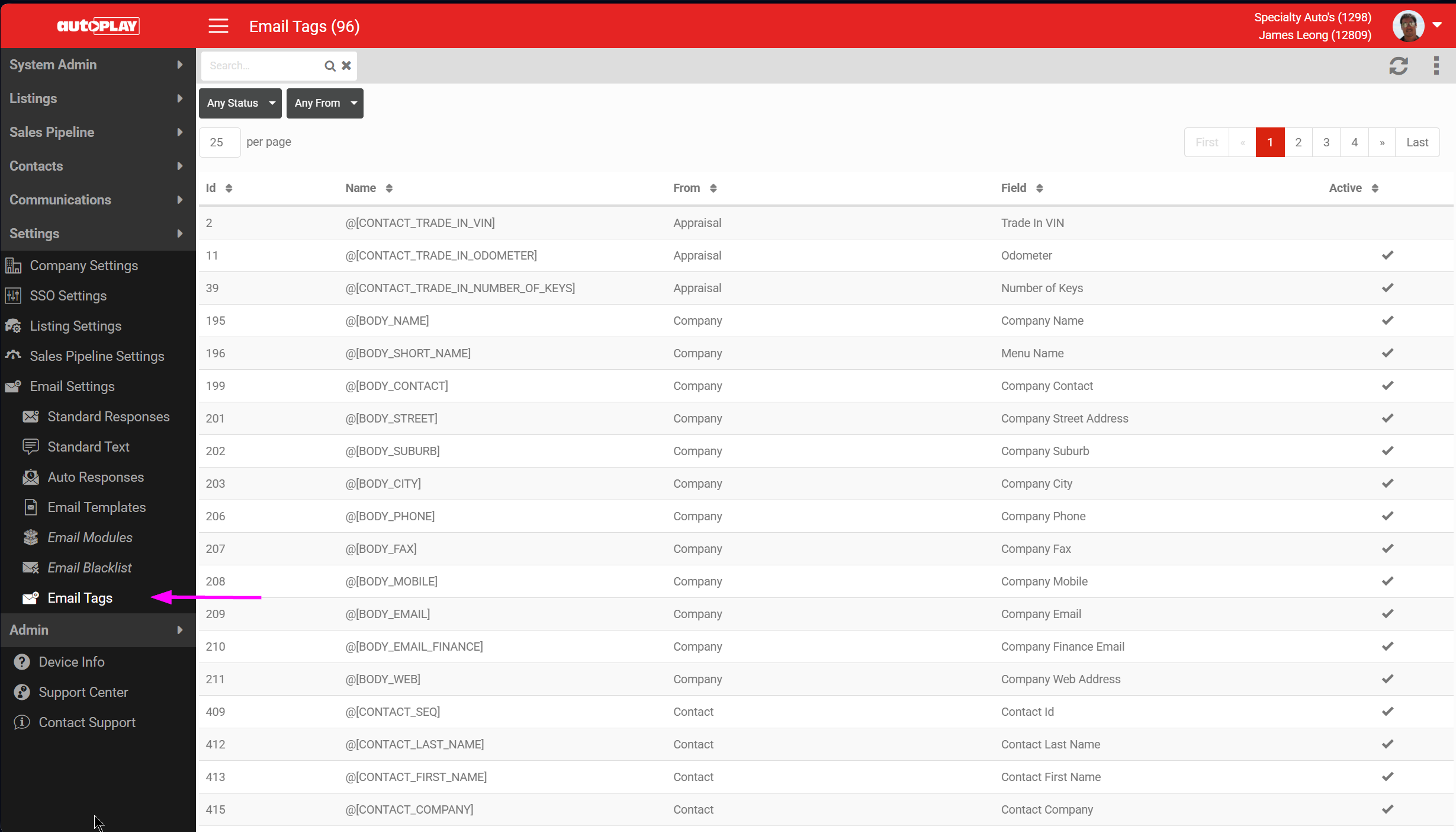 Users with access to the Email Settings screen now have visibility of a list of available Email Tags. These tags can be used in AutoPlay communications in a similar manner to mail-merge fields. This screen serves as a central repository of all supported Email Tags, with the list expanding over time as additional AutoPlay data tables are enabled.