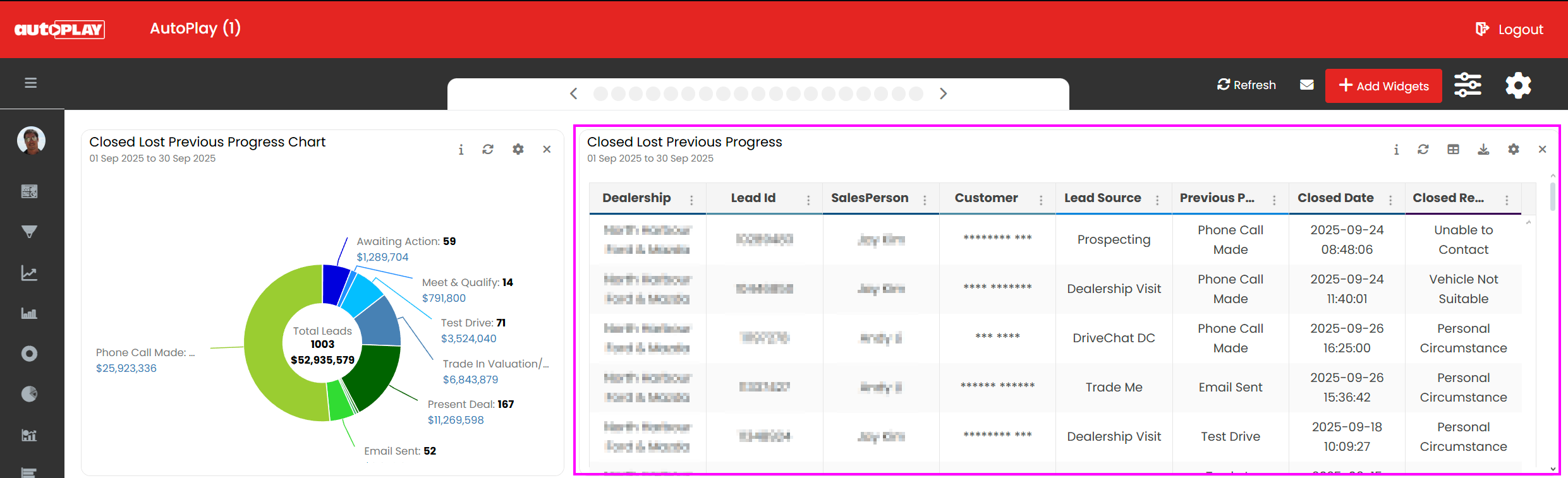 A new data table has been introduced to complement the existing Closed Lost Previous Progress Chart widget. This table displays the raw data behind the chart and also provides an option to download the dataset.