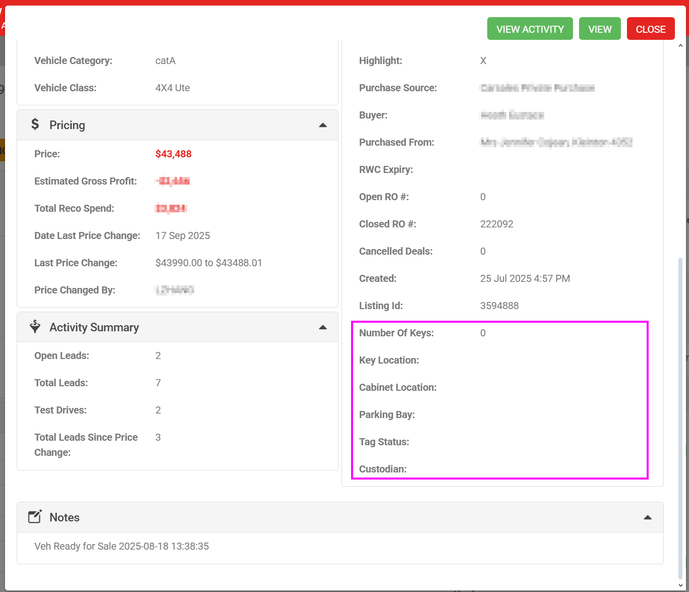New fields have been added to the Australian Listings Enhanced functionality. These fields capture details about vehicle keys and their location, as well as where the vehicle is parked on the yard. The below screenshot is the vehicle summary when clicking on the primary listing directly from the lead detail screen.