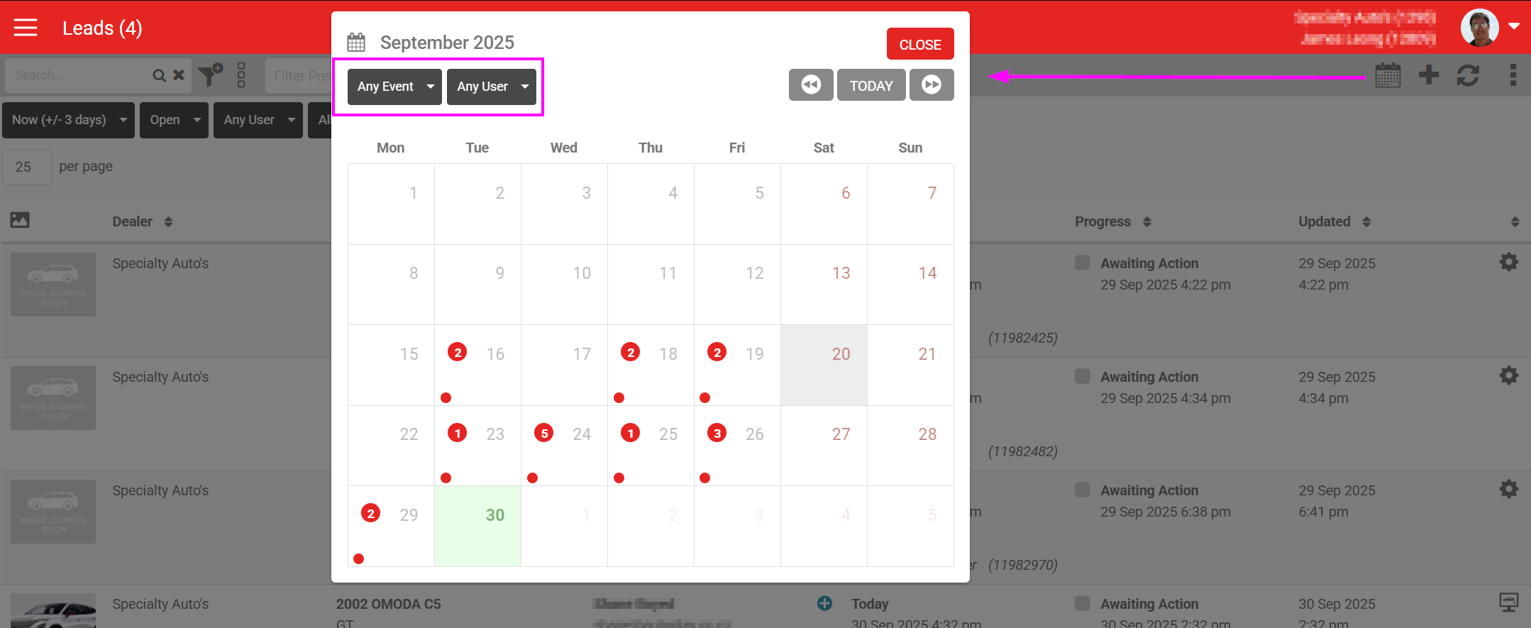 Several new filters have been added to the Prospect and Lead Dashboard calendars. When the calendar is opened, these filters will automatically mirror any existing user filters already applied to the dashboard.