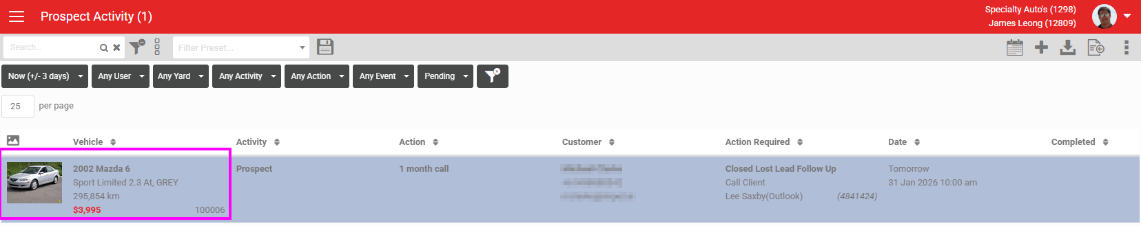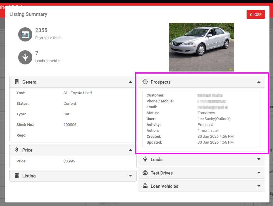 The Listing Activity window has now had a prospect accordion added to it for greater visibility of the history of actions on the vehicle itself.