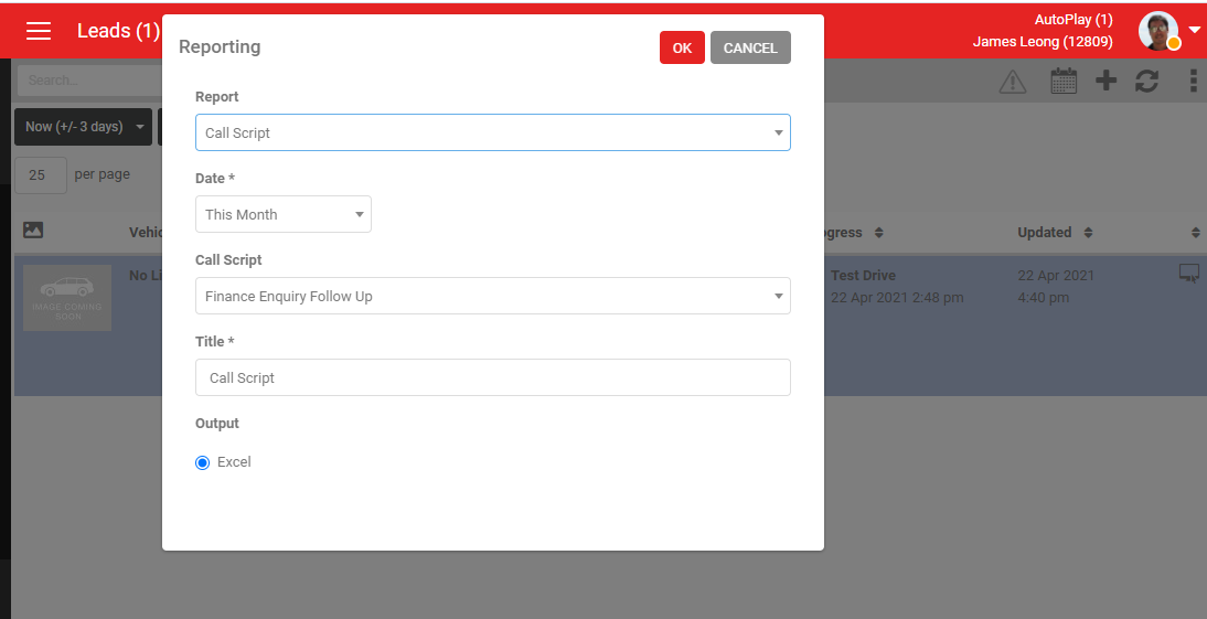 Once a User has selected the Call Script options they will be presented with a pop up window and the ability to select from any current Call Scripts available to them. This will be determined by the leads yard and Make on the listing. Once a call script is selected, the questions will appear below, and a call button will become available.