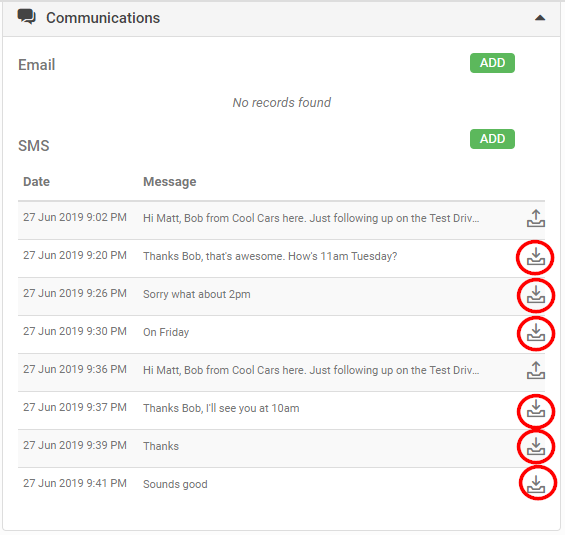 When you view the Lead you can see within the 'Communications' section there will be a mixture of the SMS you sent, and any customer replies (circled in red in the screenshot below).