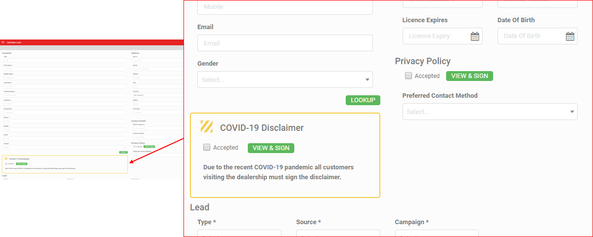 The COVID-19 Disclaimer will be visible on the View Lead screen along with the Date & Time the customer signed. This can be updated at any time if if required.