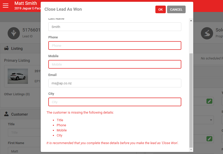 If you have the 'Close Won Validation' role, when you attempt to close a lead as won, if it is missing any relevant customer contact details such as 'Title', 'First Name', 'Last Name', 'Phone', 'Mobile', 'Email' or 'City', 'Rego', 'VIN' or 'Test Drive Completed' it will alert the user that these fields are missing.