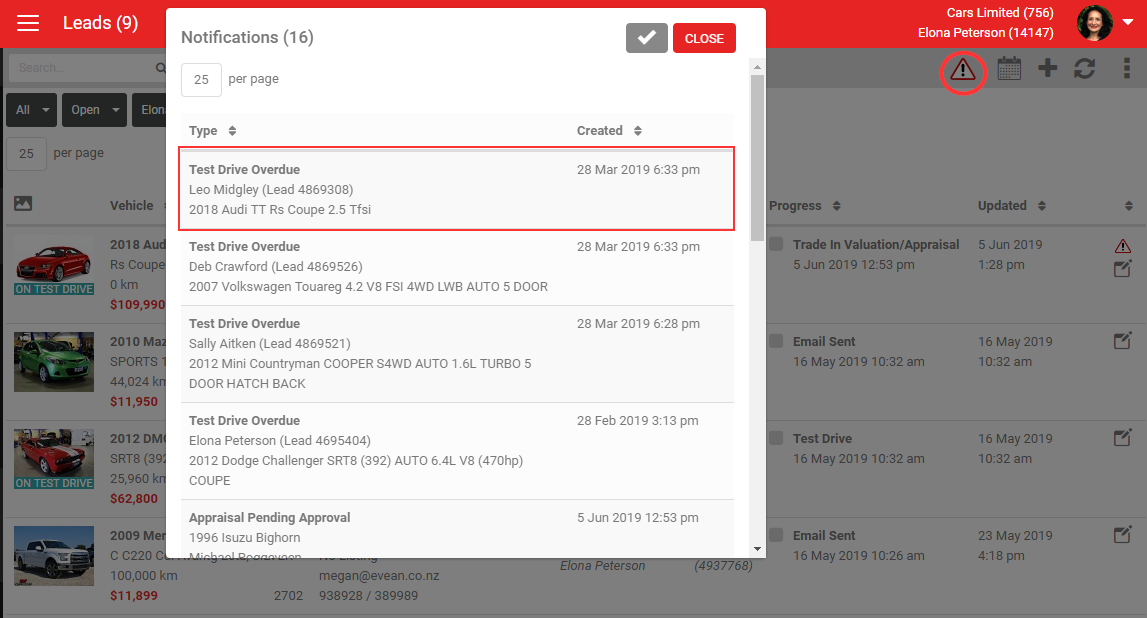 When in the Dashboard any notification appears as a small warning icon on each lead with an Overdue Test Drive.
