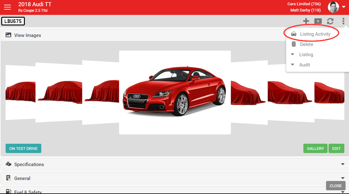 The 'Listing Activity' screen will give you a summary of the vehicle, the number of days in stock and the number of leads loaded against this vehicle in it's lifetime. You can also view the details of all the activity that has occurred against this listing incl;