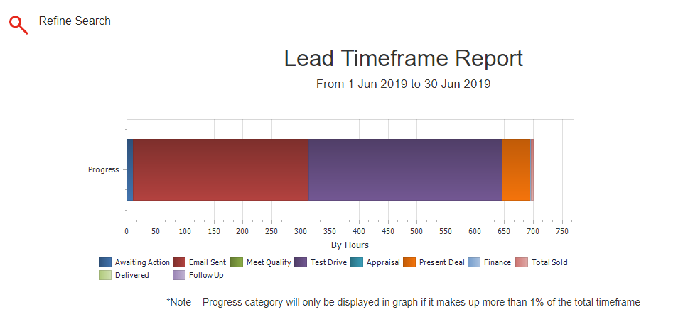 This report details the average time leads spend at each PROGRESS STAGE in the Sales Pipeline – from Awaiting Action to Closed As Won. This not only allows dealerships to identify choke points in their process, but also provides insight into how long it takes to close leads. This report can be run by dealership or SalesPerson.