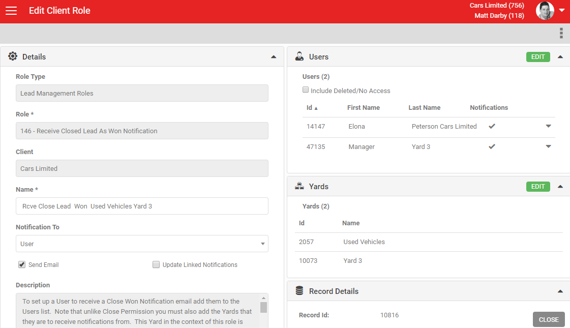 A new role has been added “Receive Closed Lead as Won Notification'. This is a Yard based role. Any users added to the role, will receive a notification of any leads that are set to ‘Close Won’ for the specified yards.