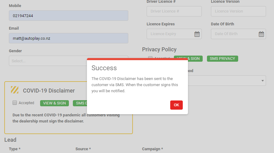 With the COVID-19 pandemic becoming 'contactless' has become a key part of conducting test drives and managing customer leads. As of 29/04/20 AutoPlay has built in the ability to send the customer an SMS of the Terms and Conditions that they are required to sign, in order for the customer to sign them on their own device (instead of the salespersons or a shared device that would require disinfection after every use). The new functionality is built into the following T&C's;