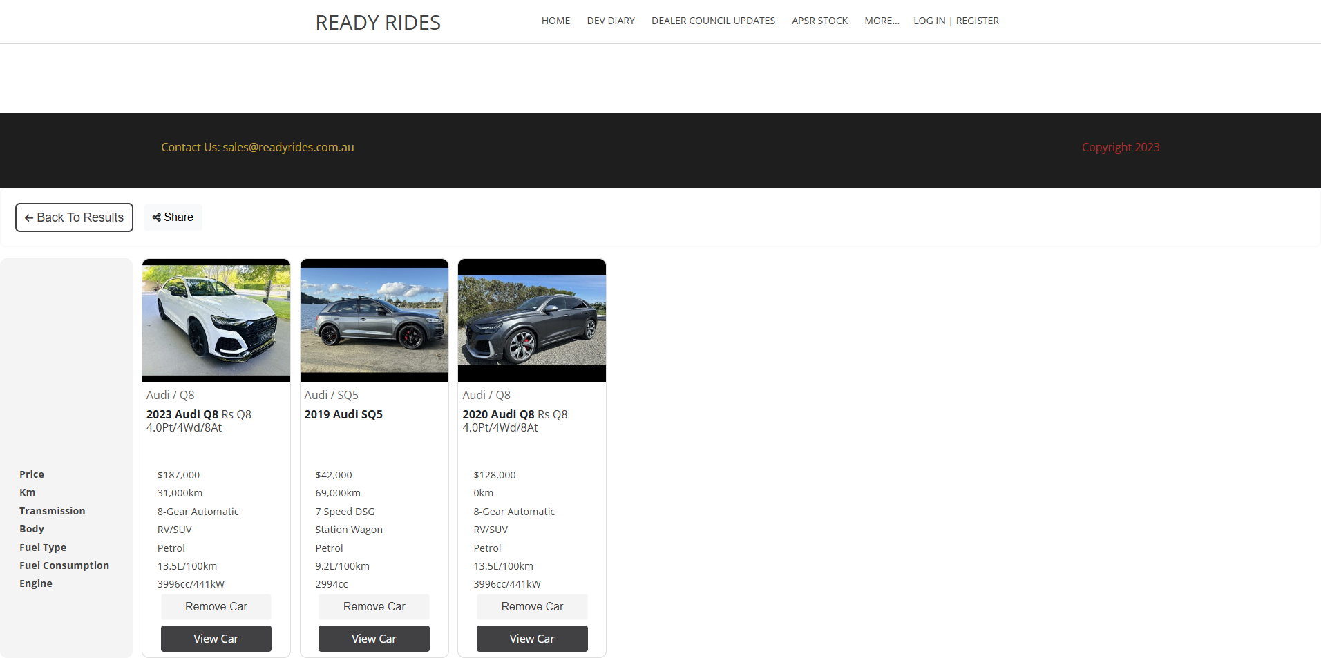 Compare saved vehicles side by side