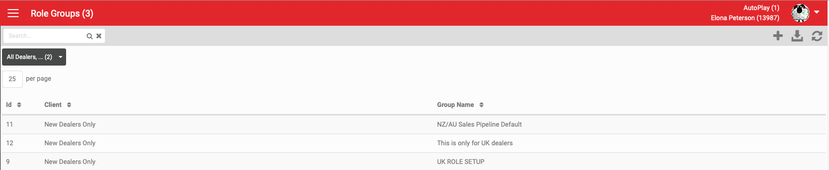 - The Role Groups that display are setup in the Role Group screen under the Client 'New Dealers Only'.