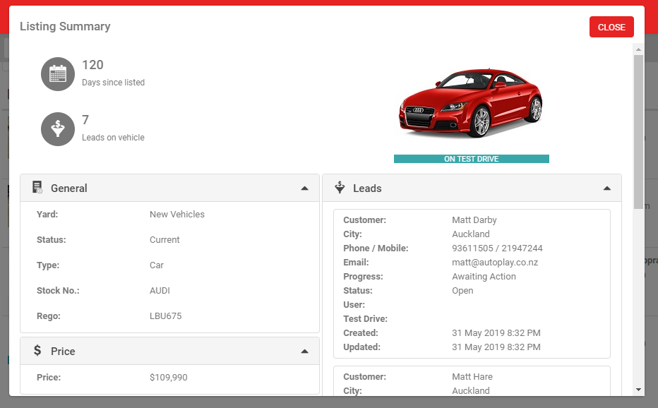 This function can be very useful when lowering a price, or when a similar vehicle comes into stock. By viewing all of the leads loaded against the listing you are easily able to identify who to target about any price change or similar vehicle that comes into stock. This process can be automated via